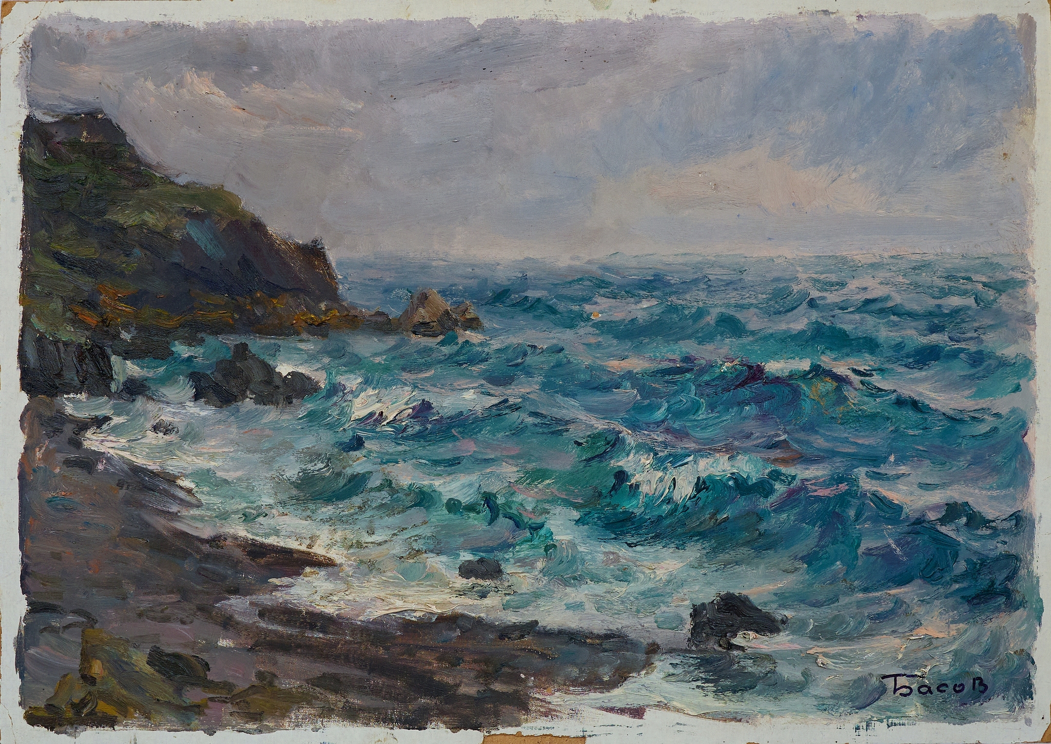 Картина Я. Басова "На берегу в непогоду" картон/масло 49х35